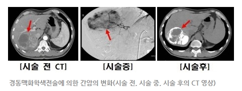 여러 치료방법 중 현재 간암으로 진단되는 환자들 중 대략 절반 정도는 수술이나 국소 치료술이 우선적으로 고려될 수 없는 여러 개의 종양, 혹은 혈관을 침범한 진행된 종양을 갖고 있거나, 간 기능이 매우 저하되어 있는데, 이때 가장 흔히 사용되는 치료법이 경동맥화학색전술(經動脈化學塞栓術, transarterial chemoembolization, TACE, 이하 색전술)이다. 이는 간암의 종괴(덩이)는 혈관이 잘 발달한 경우가 많다는 점을 이용하는 것으로, 종괴에 혈액을 공급하는 동맥을 찾아서 항암제에다 요오드 성분의 물질인 리피오돌(lipiodol, 지용성 조영제)을 혼합하여 주입하고는 그 혈관을 ‘색전물질’로 막아 버리는 방법이다(‘색전’은 닫아서 막는다는 뜻이다).